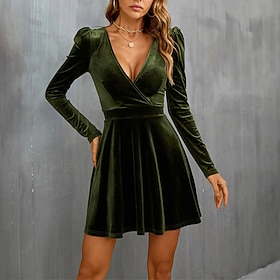Women's Party Dress Velvet Dress A Line Dress Mini Dress Black Wine Army Green Pure Color Long Sleeve Winter Fall Spring Ruched Fashion V Neck Slim Party Winte