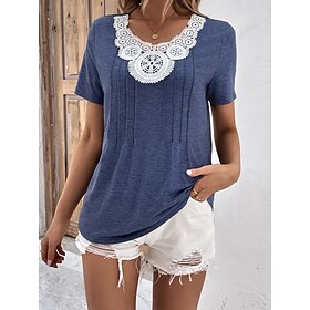 Women's T shirt Tee Navy Blue Lace Plain Daily Weekend Short Sleeve Round Neck Basic Regular S
