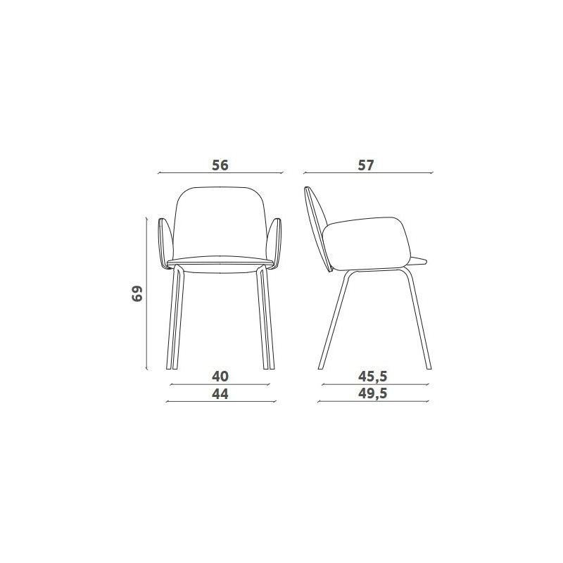 Sedia By Bonaldo La sedia By ha un design semplice e lineare, ideale per qualsiasi tipo di arredamento. Dalle linee leggere e delicate, By è realizzata con una struttura in acciaio e con rivestimento disponibile in ecopelle, ecopelle vintage e pelle Capri, realizzabile in diverse tonalità di colore. L'imbottitura in poliuretano la rende una seduta comoda dalle linee eleganti, mentre le gambe sono in legno massello di frassino in diverse finiture, che donano stabilità e robustezza alla sedia. By è perfetta per dare un tocco di modernità e glamour sia negli ambienti domestici che contract STRUTTURA BY BONALDO: La sedia By è realizzata con struttura in acciaio, seduta imbottita in poliuretano schiumato a freddo, rivestita in pelle, ecopelle o tessuto, in varie finiture di colore. Gambe in legno massello di frassino in diverse finiture: Frassino carbone Frassino color noce La seduta è rivestita con i seguenti rivestimenti in: Tessuto Ecopelle Ecopelle vintage Pelle Le finiture sono disponibili nel campionario dei materiali. MISURE BY BONALDO: TEMPI DI CONSEGNA: Tempo stimato per la produzione e la consegna del prodotto 7/9 settimane lavorative dal pagamento ricevuto.In questo periodo le consegne da parte delle aziende produttrici potrebbero subire ritardi.