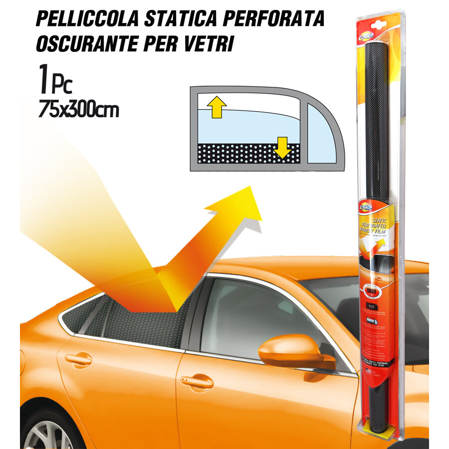 Pellicola statica perforata oscurante per vetri. Questa innovativa pellicola statica è stata progettata su misura per il cliente più esigente. Non servono ventose, applicazione elettrostatica. Alzi ed abbassi i finestrini senza doverla rimuovere. Protegge dal sole e dai raggi dannosi UV. Blocca l'abbagliamento del sole e riduce il calore dell'abitacolo. Riutilizzabile grazie all'incredibile lunga durata. Può essere ripetutamente applicata e rimossa dai vetri dell'auto. Applicabile nei vetri di: auto, furgoni, fuoristrada, barche, ufficio, casa... 4 stagioni: installabile in tutti i periodi dell'anno. Va applicata su vetro piano
