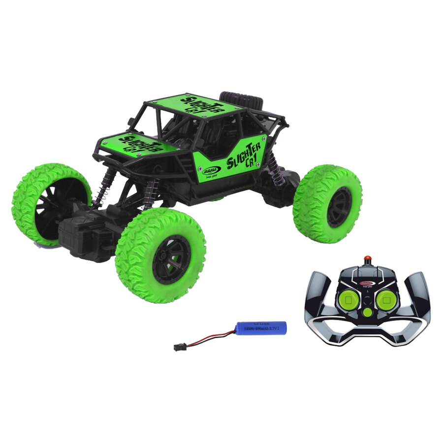 Modellino radiocomandato. 2,4 GHz per il funzionamento multigiocatore. Telaio completamente sospeso. Ruote in gomma. Convergenza regolabile. Capacità di arrampicata estrema. Diecast. Batteria sostituibile. Funzioni: velocità circa 9 Km/h, avanti/indietro, destra/sinistra, stop. Batteria LiIon 3,7 V 400 mAh. Per il telecomando servono 2 batterie AA 1,5V (non incluse)