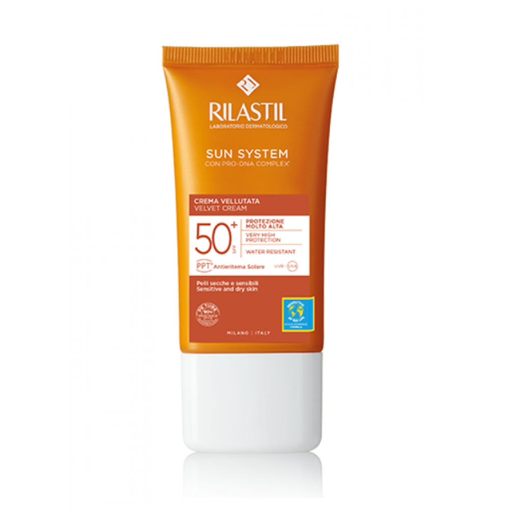981042904 - Rilastil Sun System Crema Vellutata SPF50+ Protezione solare molto alta resistente all'acqua Rilastil Sun System Crema Vellutata SPF50+ è una protezione solare resistente all'acqua che grazie alla sua texture extra soffice a rapido assorbimento è capace di creare un effetto idratante sul vis