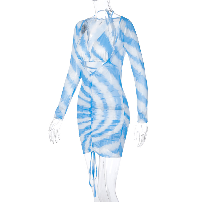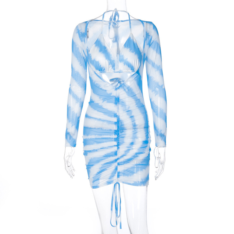 2022 spring new womens drawstring pleated mesh dress suspenders wrap chest suit blue S