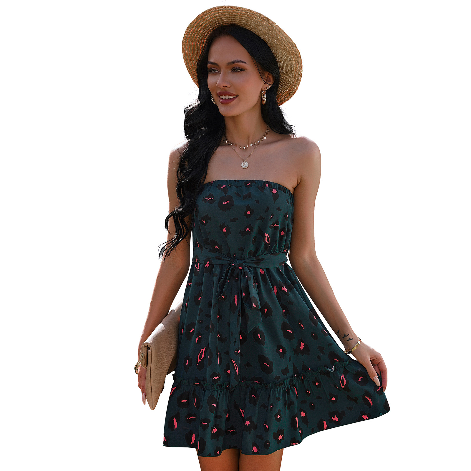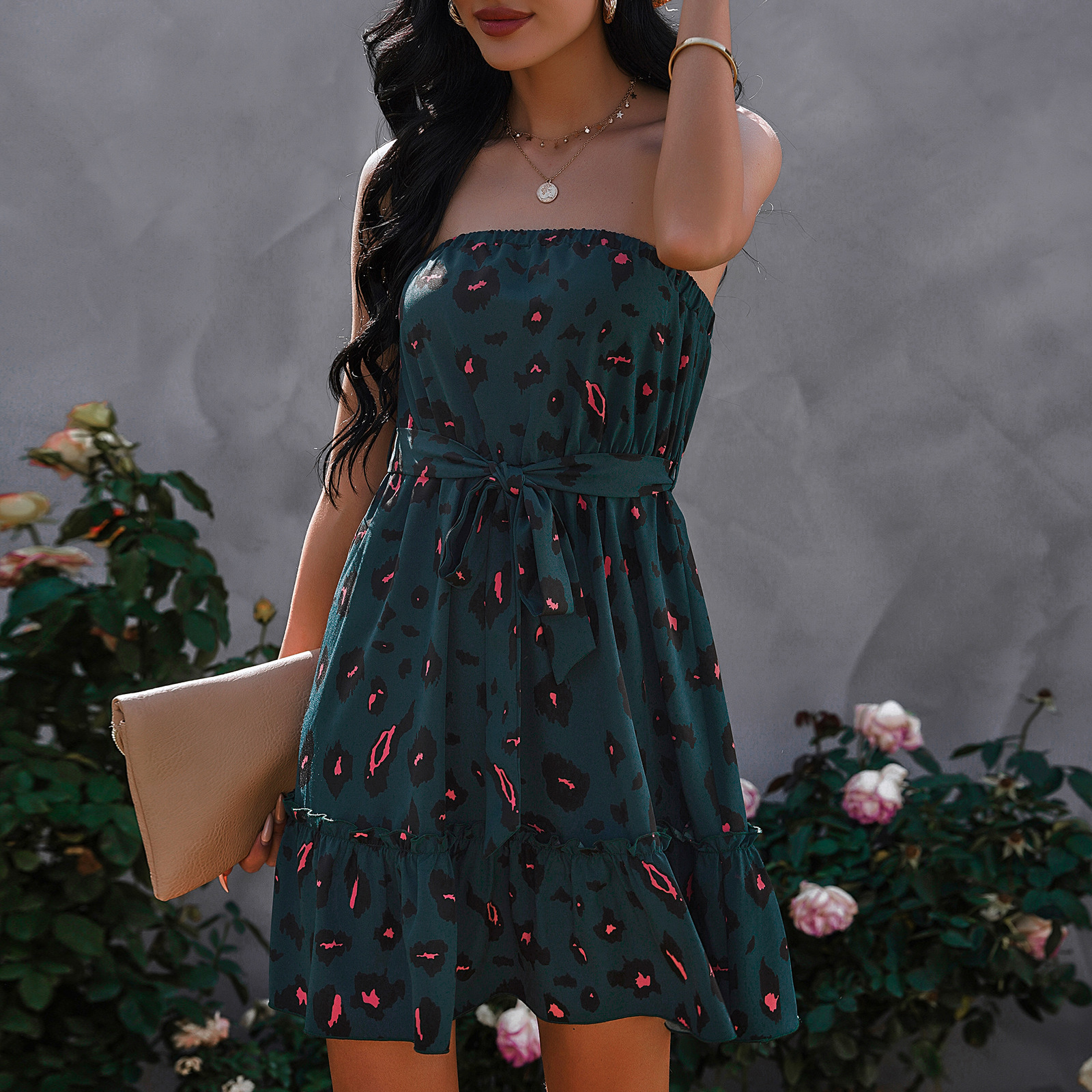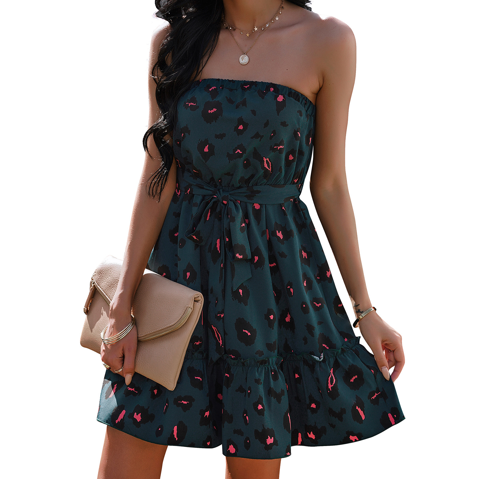 Spring and summer new breast wrap skirt womens strap print sexy backless dress dark green L