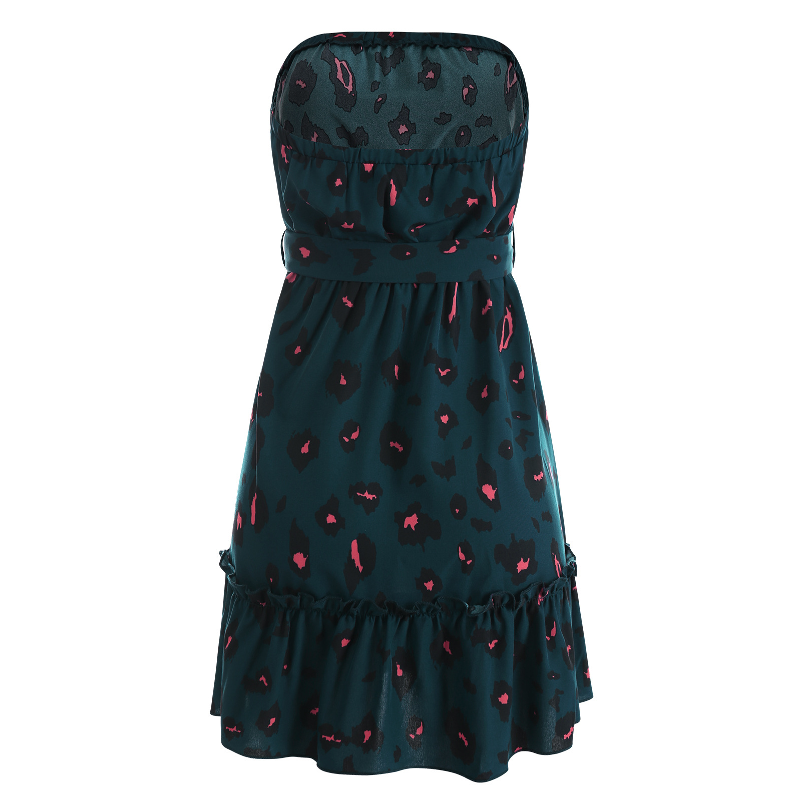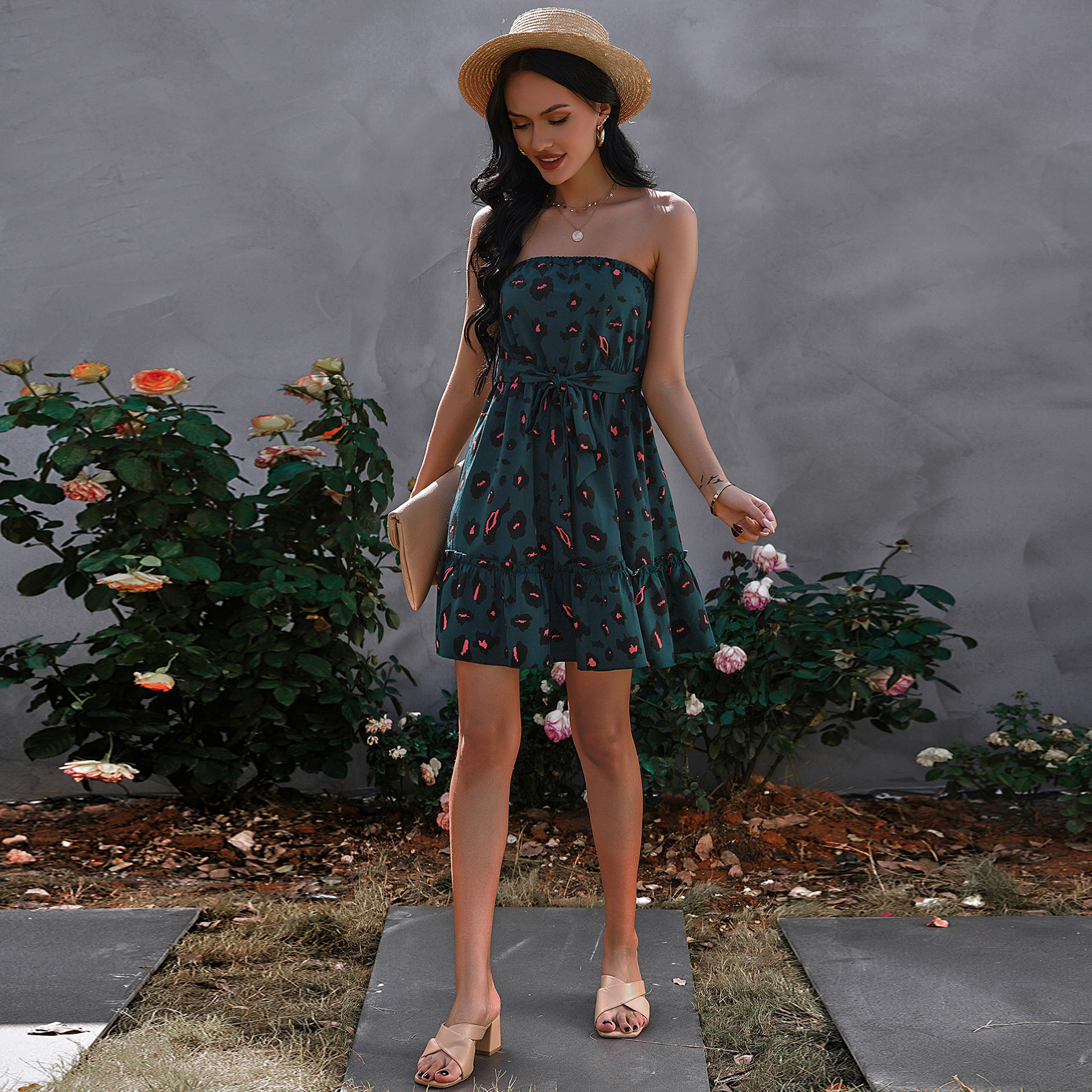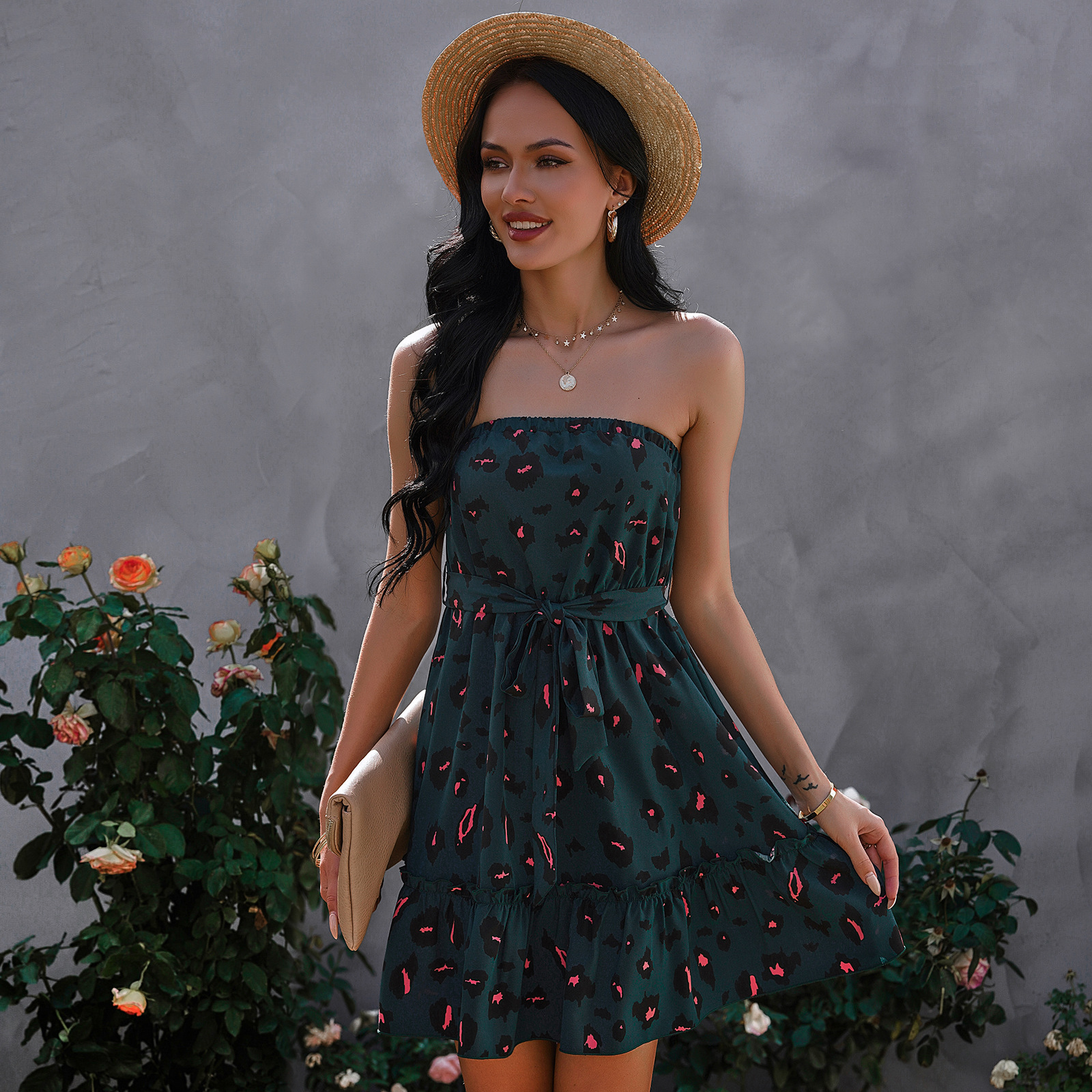 Spring and summer new breast wrap skirt womens strap print sexy backless dress dark green L