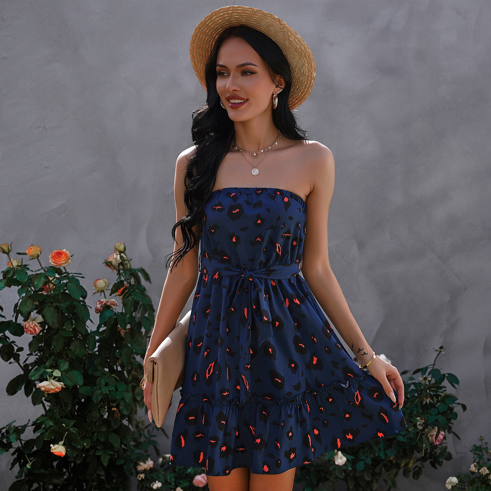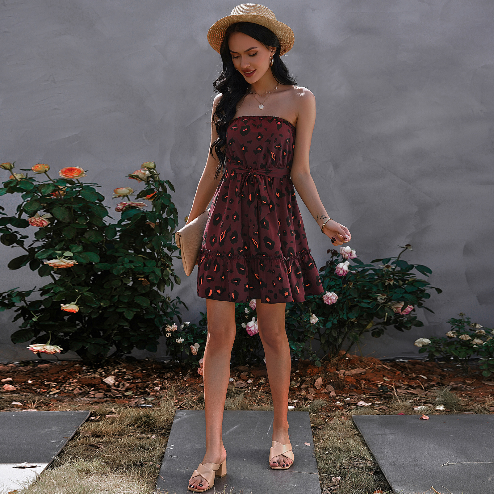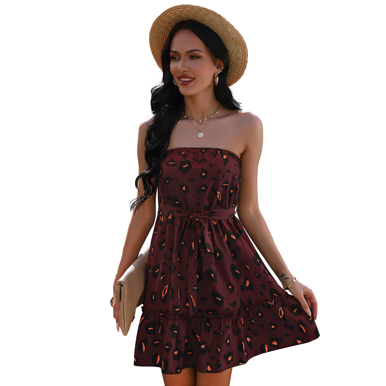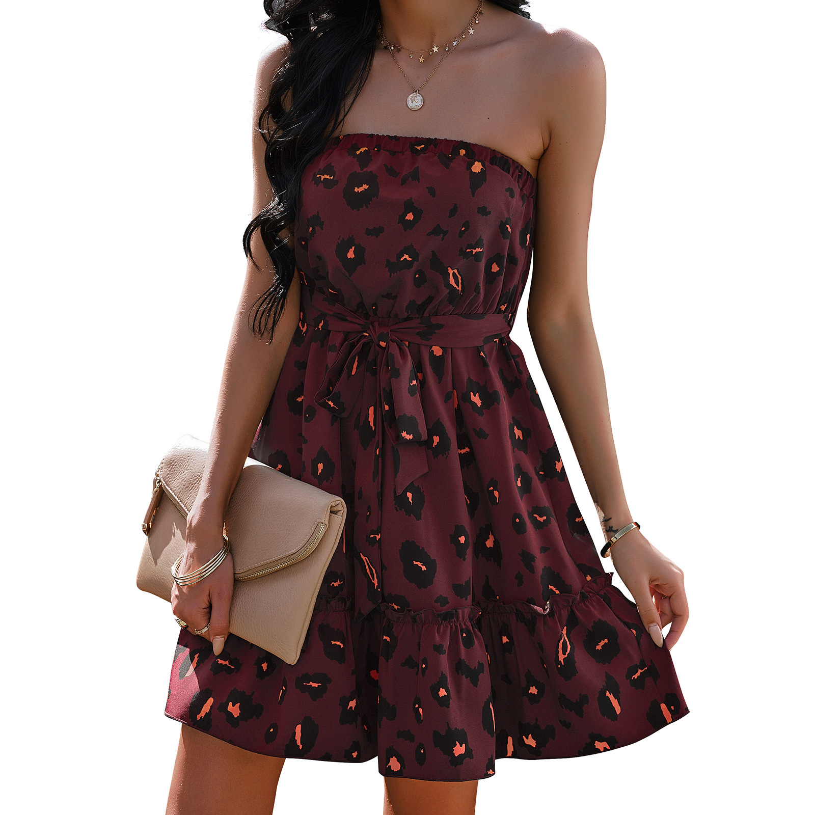 Spring and summer new breast wrap skirt womens strap print sexy backless dress red L