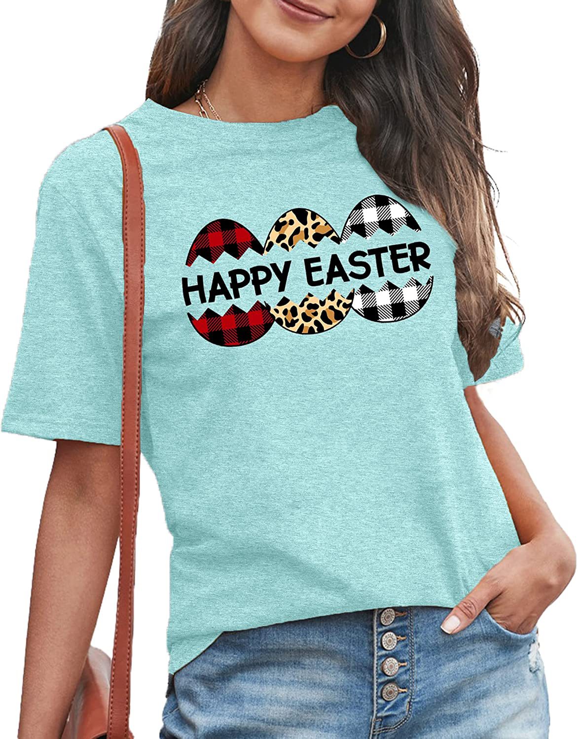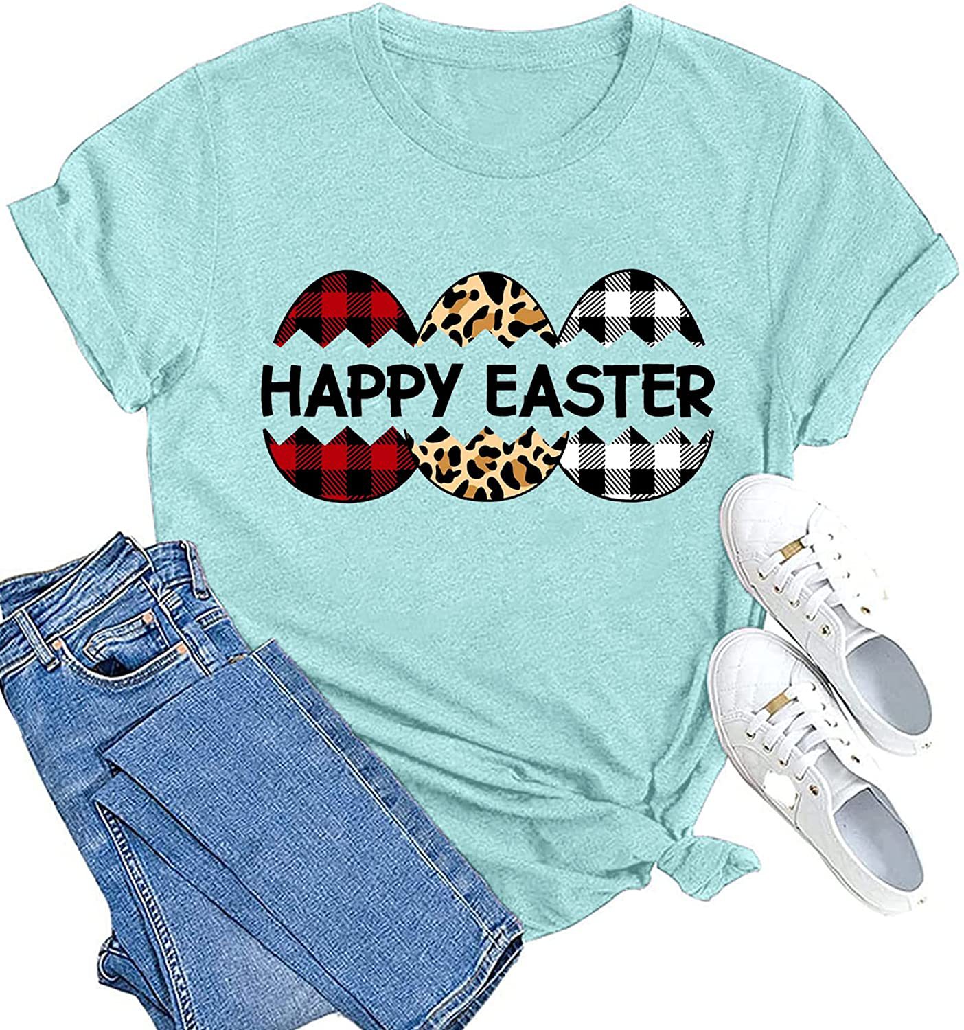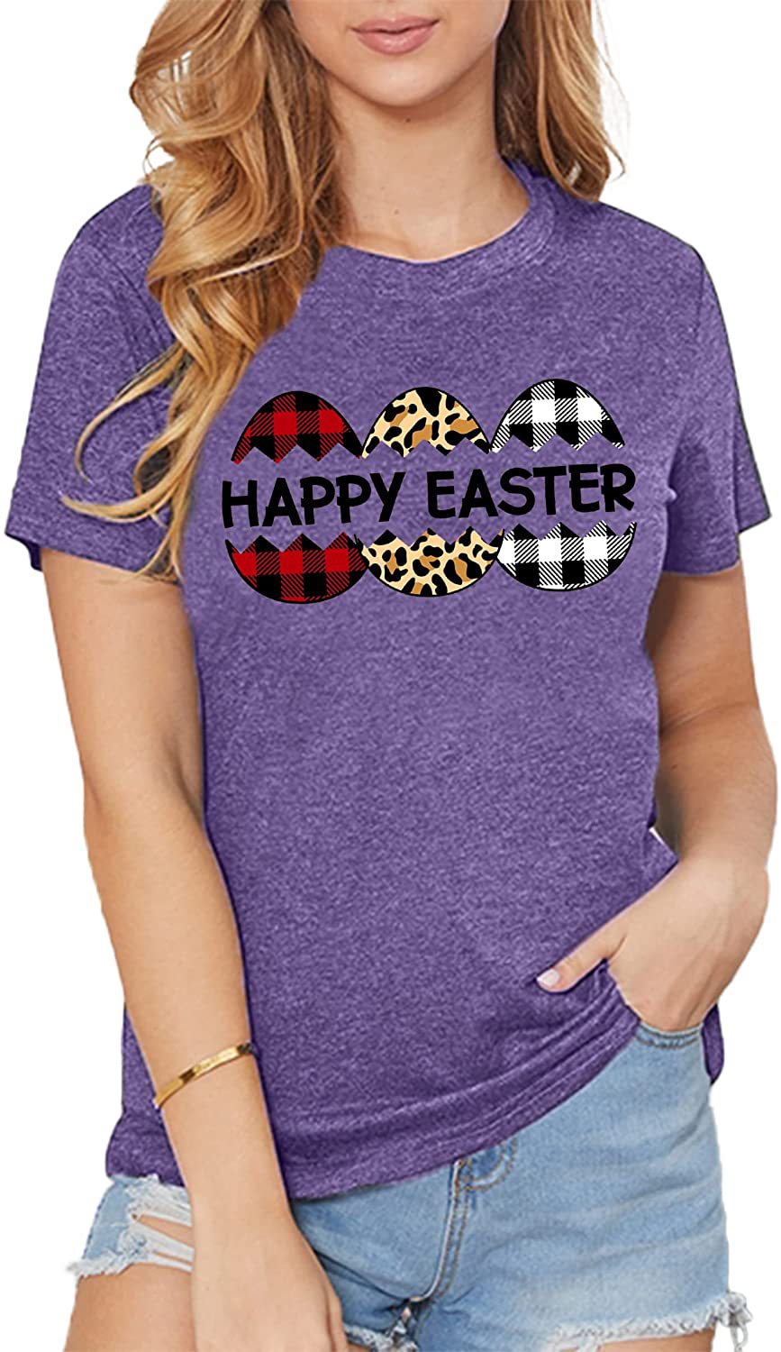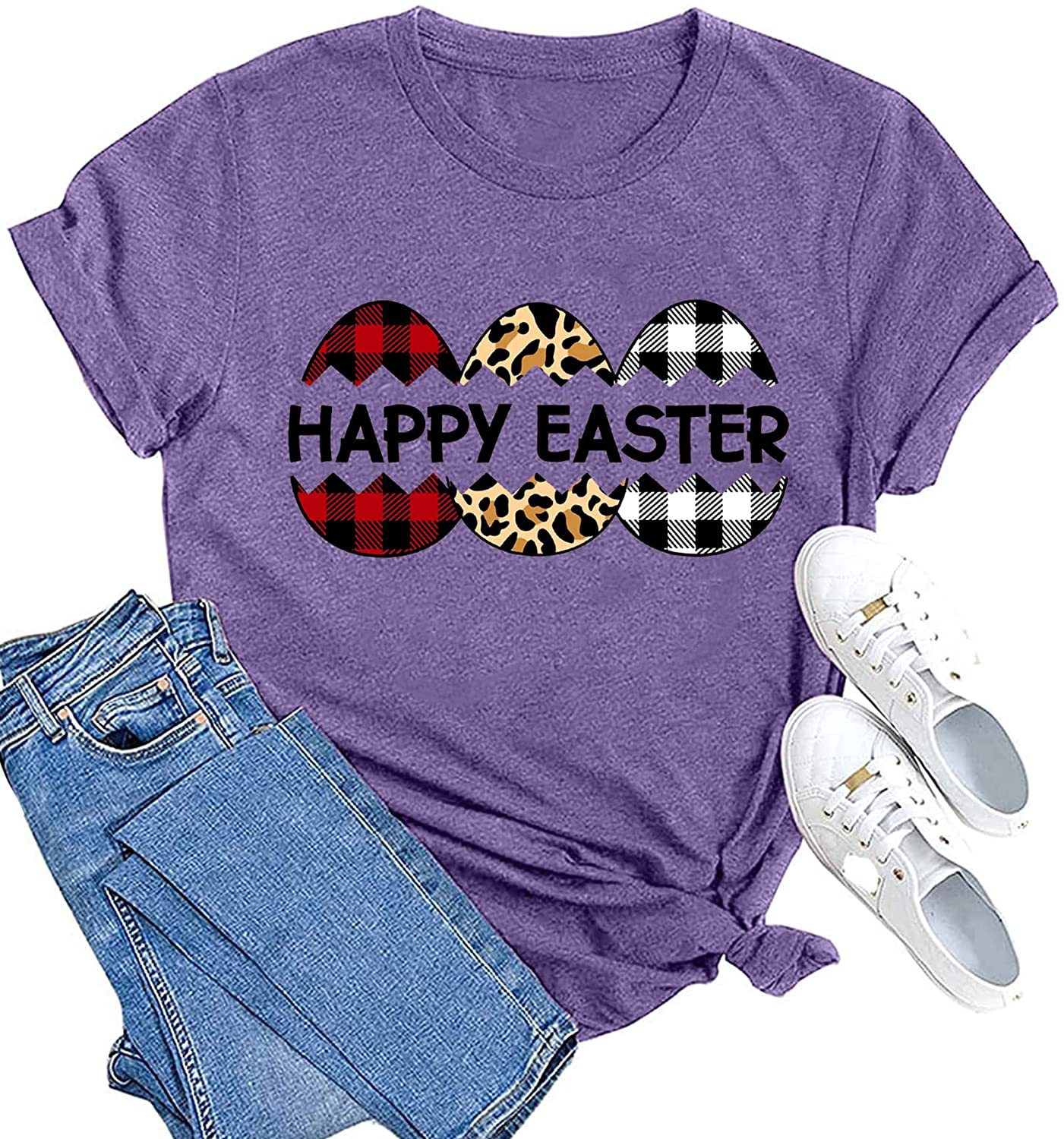 2022 New Ladies Happy Easter T-Shirt Buffalo Plaid Leopard Egg Short Sleeve Holiday T-Shirt Purple XXL