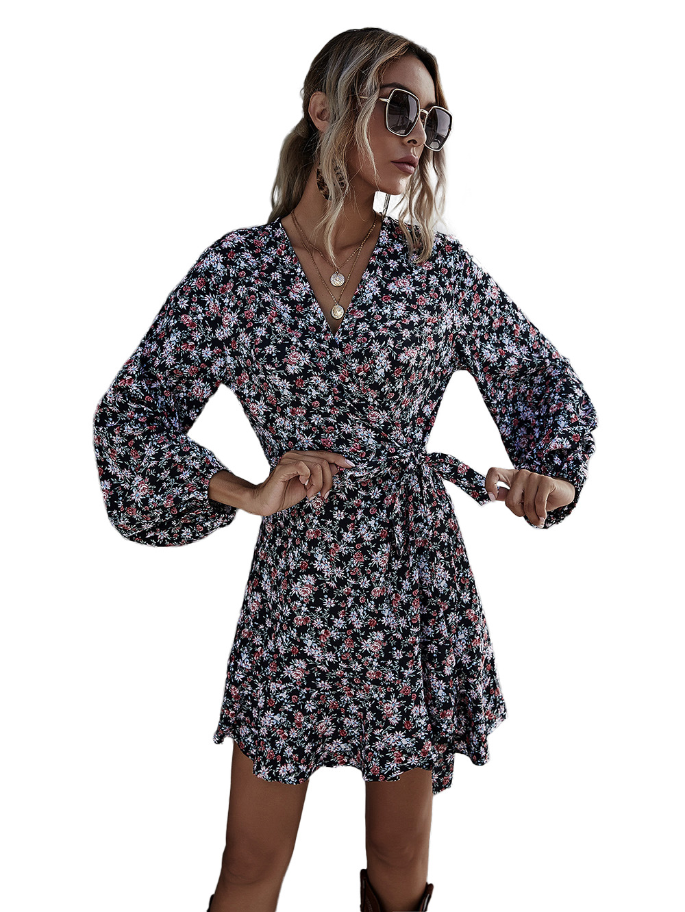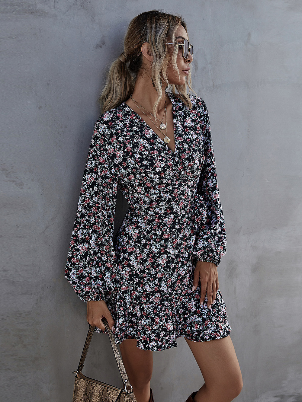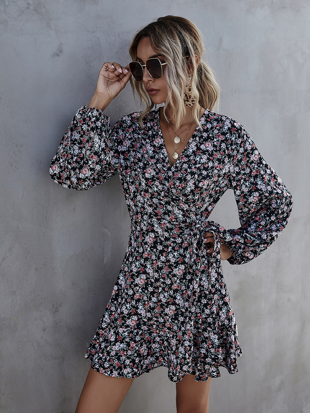 Short skirt high waist printed halter neck high-quality commuter black V-neck loose pullover European and American dress black M