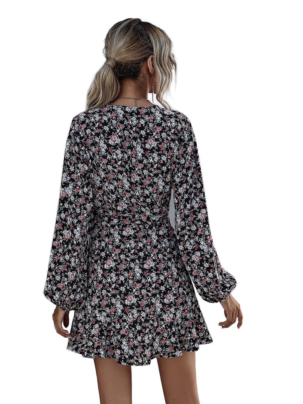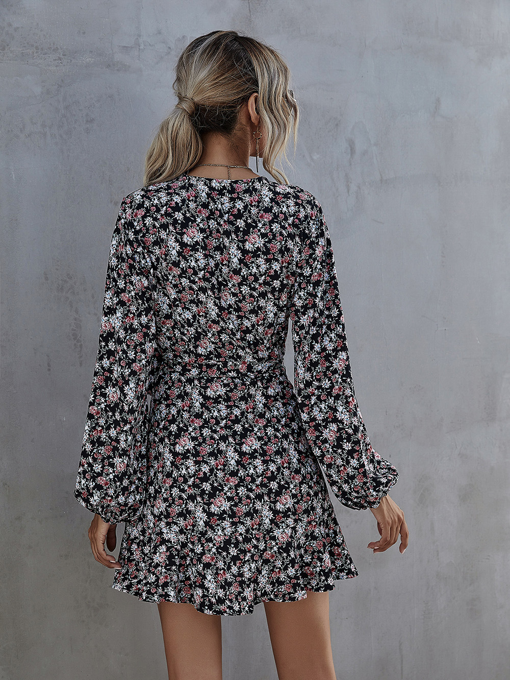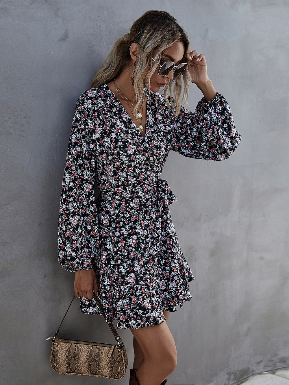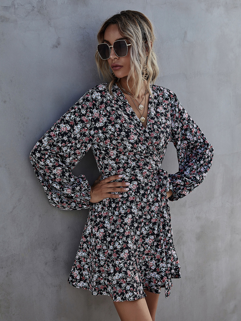 Short skirt high waist printed halter neck high-quality commuter black V-neck loose pullover European and American dress black M