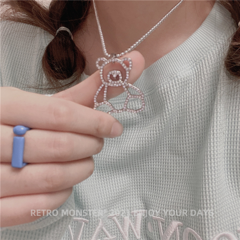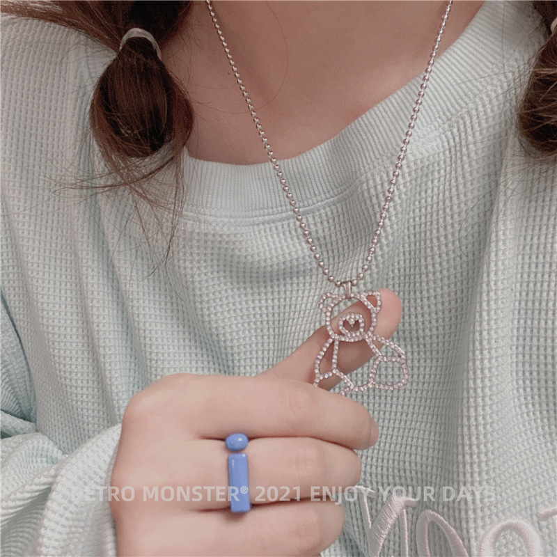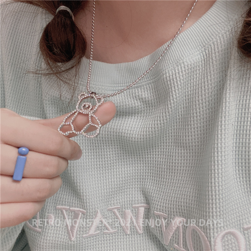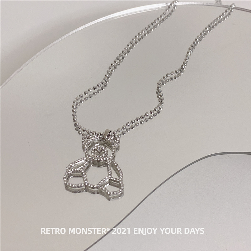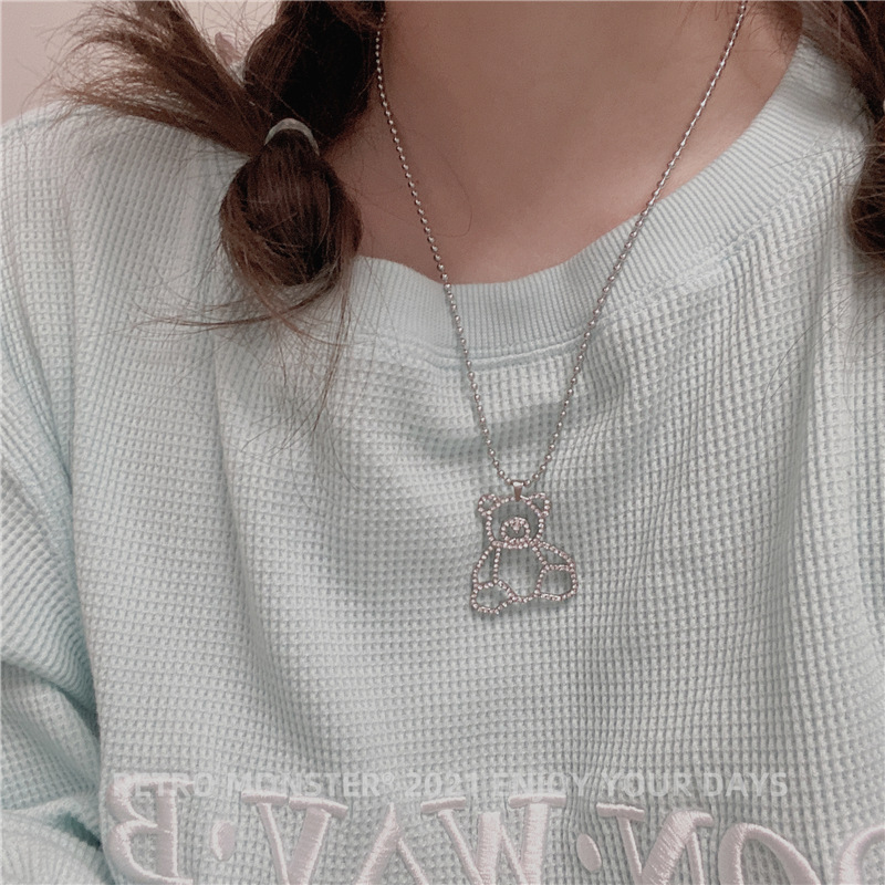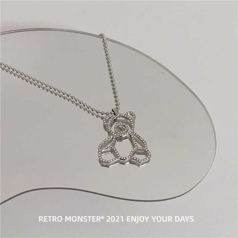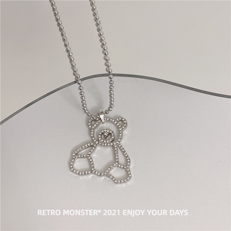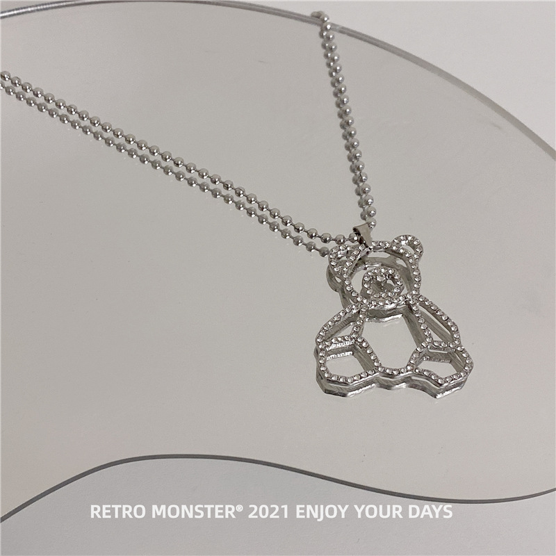 Hip Hop Silver Bear Street Necklace Silver Diamond Bear Titanium Necklace
