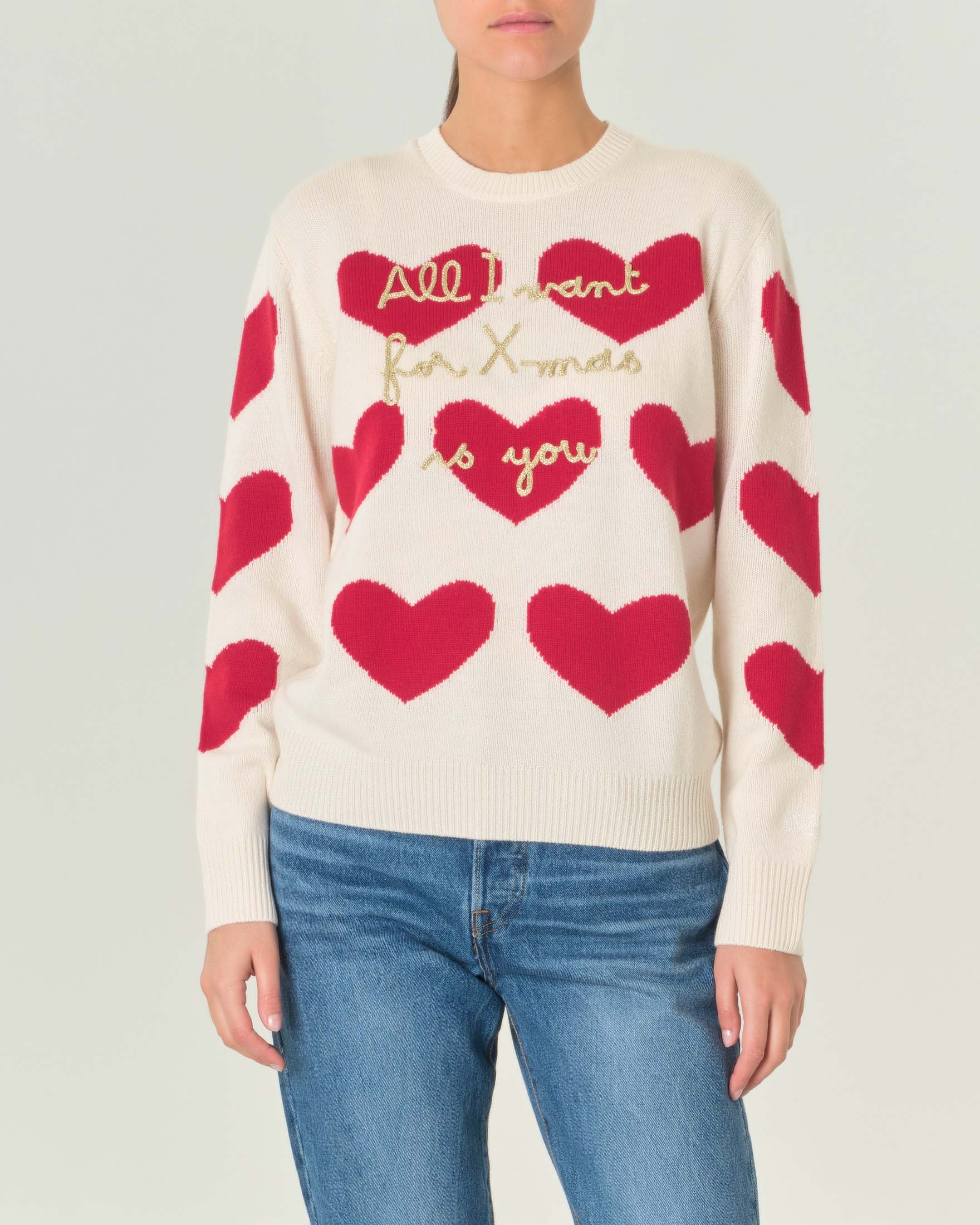 Maglia avorio in lana e cashmere a cuori rossi jacquard e scritta All I want for Xmas is you in lurex dorato
