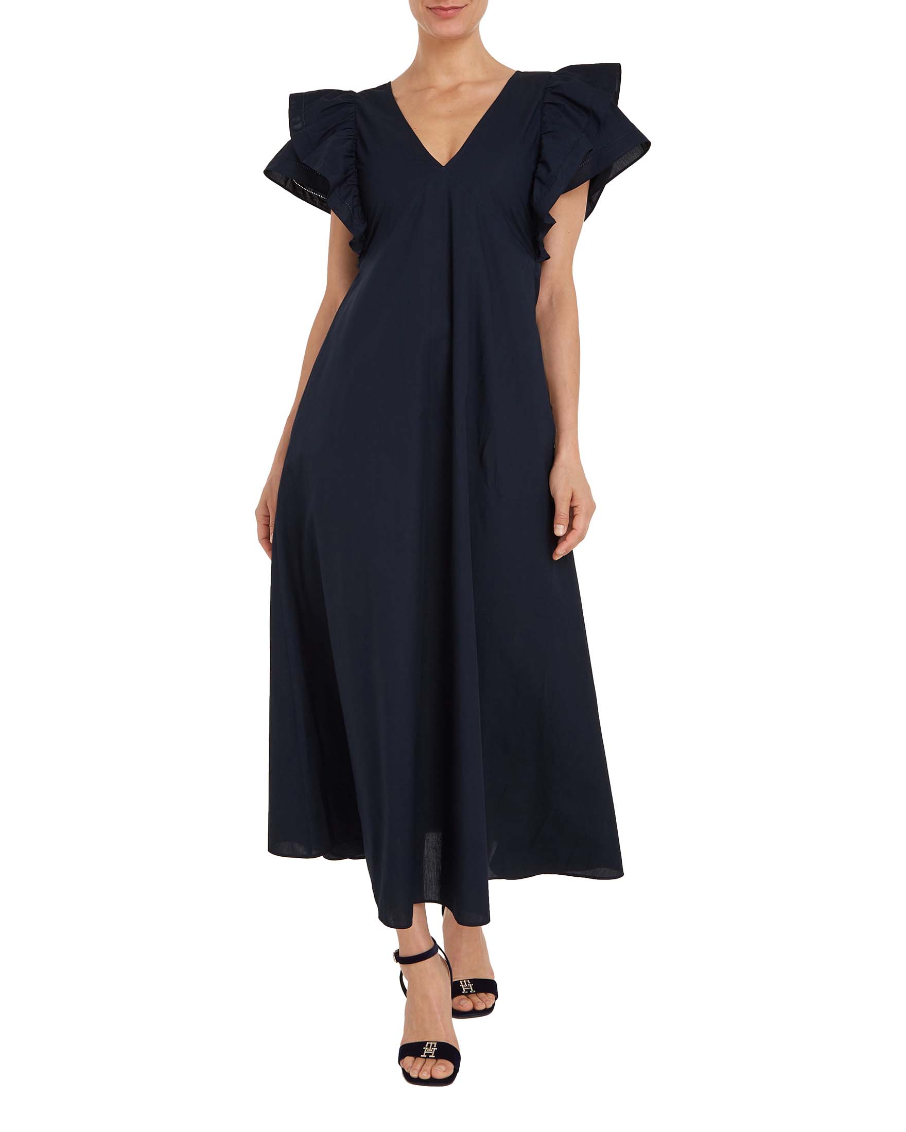 Abito lungo blu in popeline di cotone dalla linea a impero con maniche corte a volant