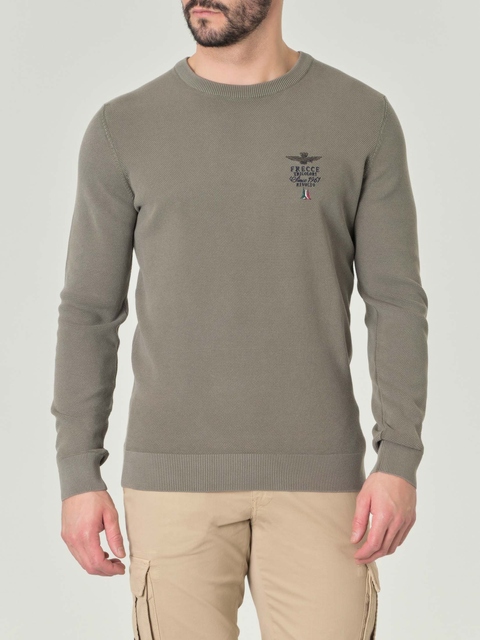 Maglia blu girocollo in puro cotone con logo aquila ricamata sul petto
