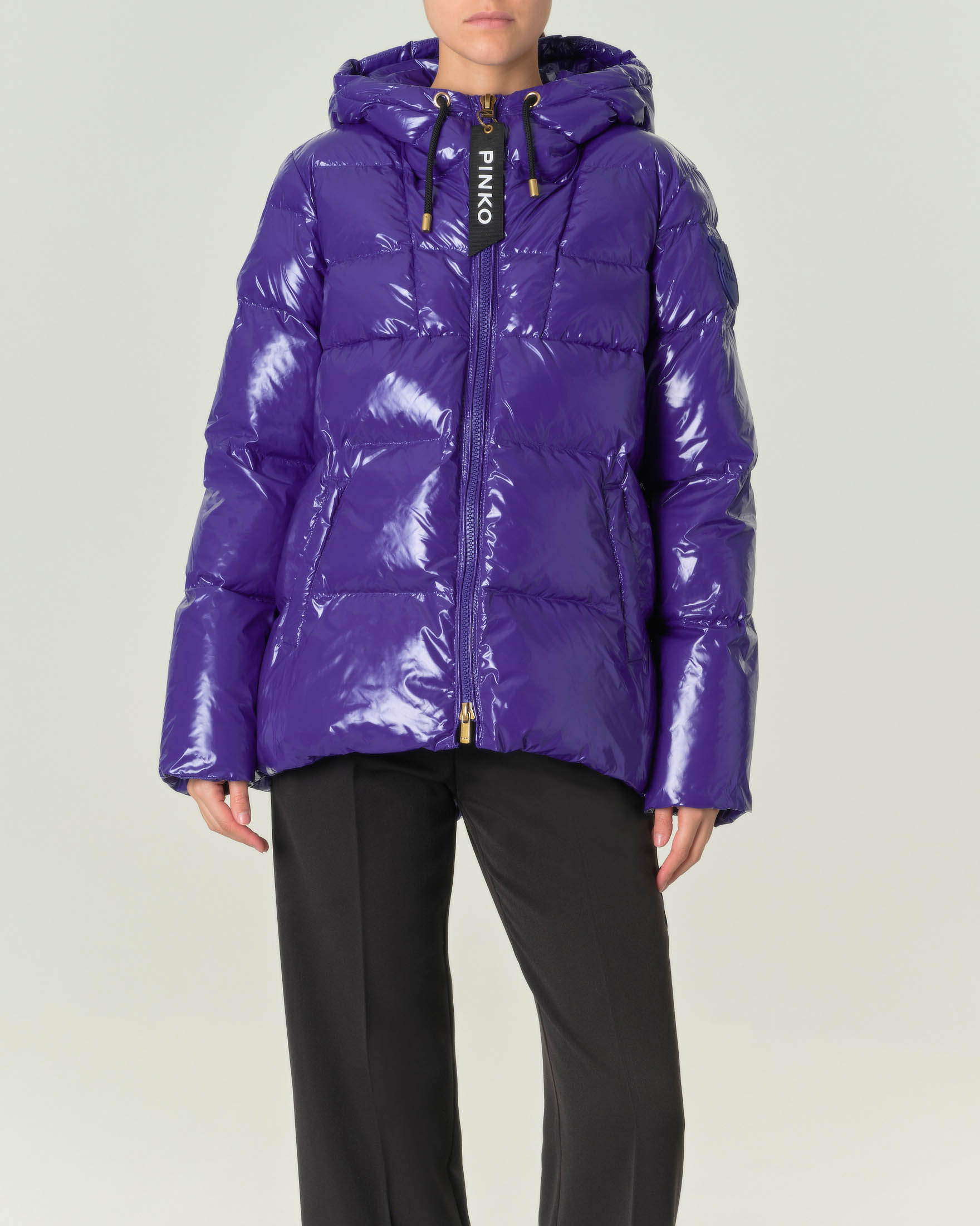 Piumino viola in nylon lucido dalla linea oversize con cappuccio con coulisse