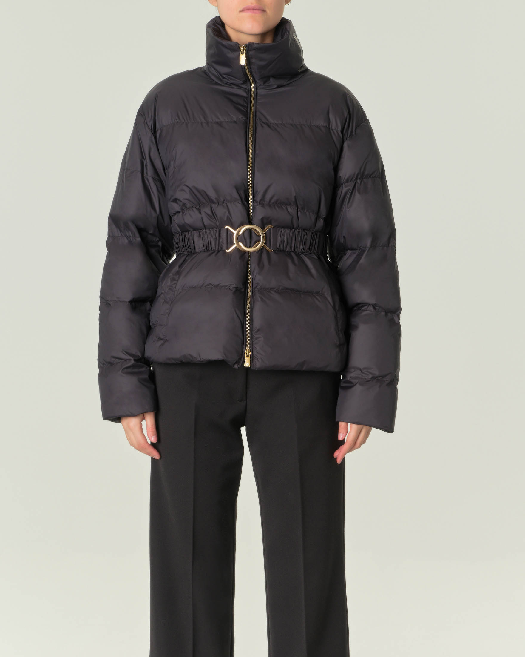 Piumino nero con collo alto con logo effetto lucido e cintura in vita goffrata con fibbia dorata a incastro
