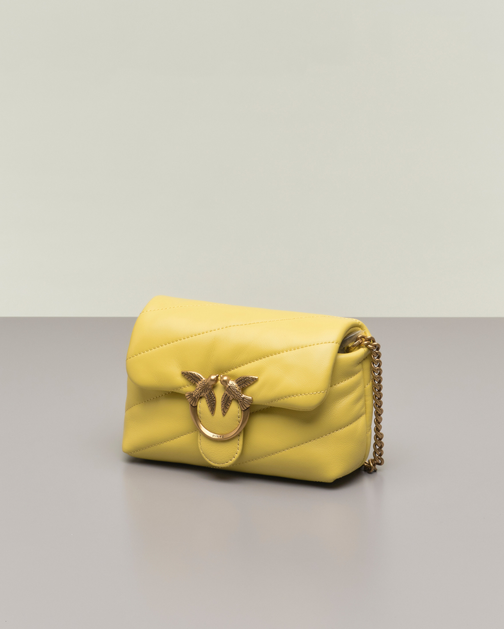 Baby Love Puff Bag in pelle gialla lavorazione quilted e tracolla a catena dorata con fibbia Love Birds