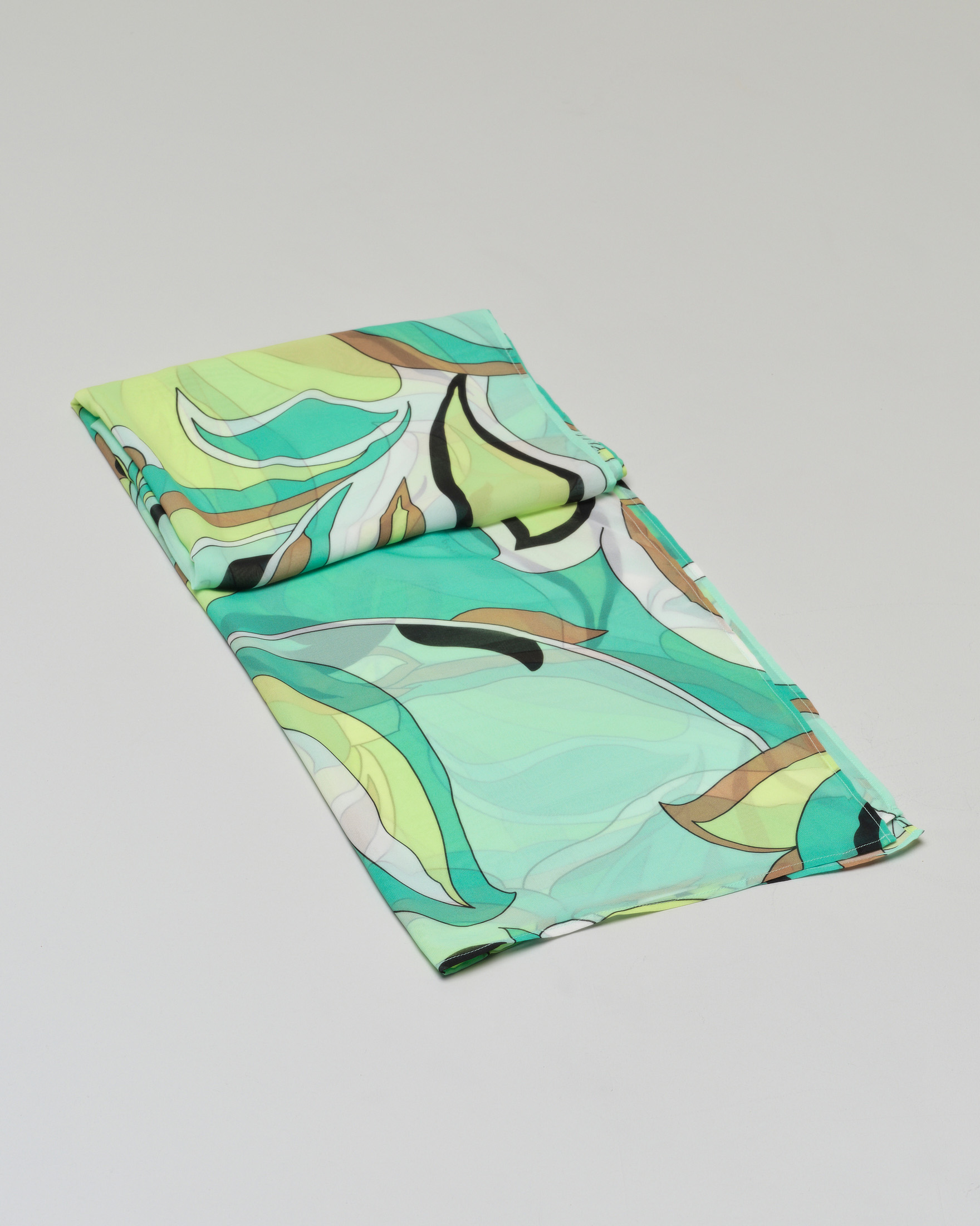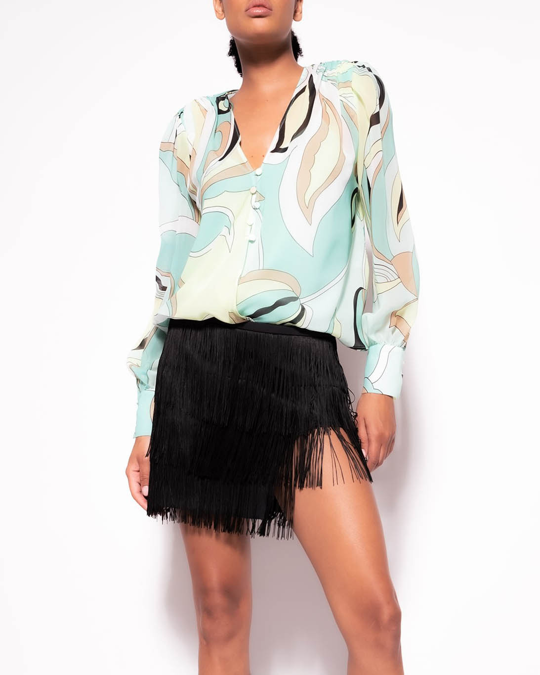 Blusa in georgette a fantasia multicolore verde e pesca con spalline imbottite e scollo a V