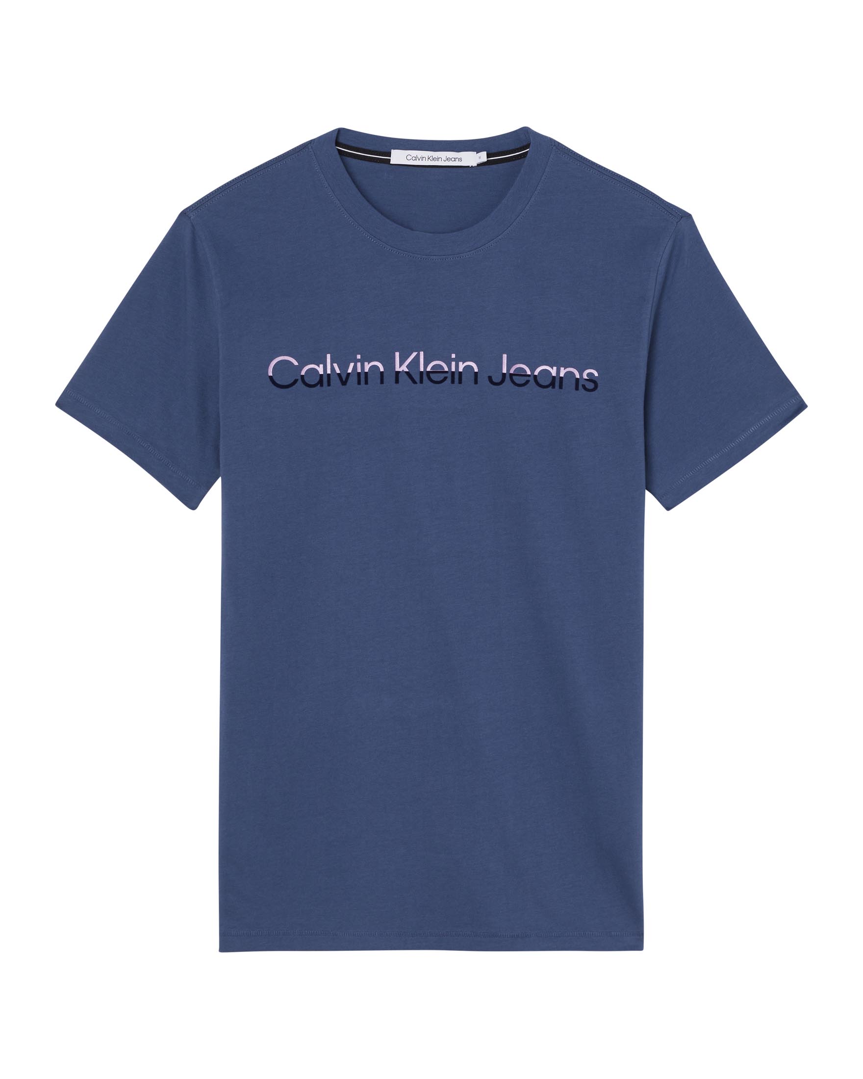 T-shirt blu indaco mezza manica con logo scritta bicolore stampato sul petto