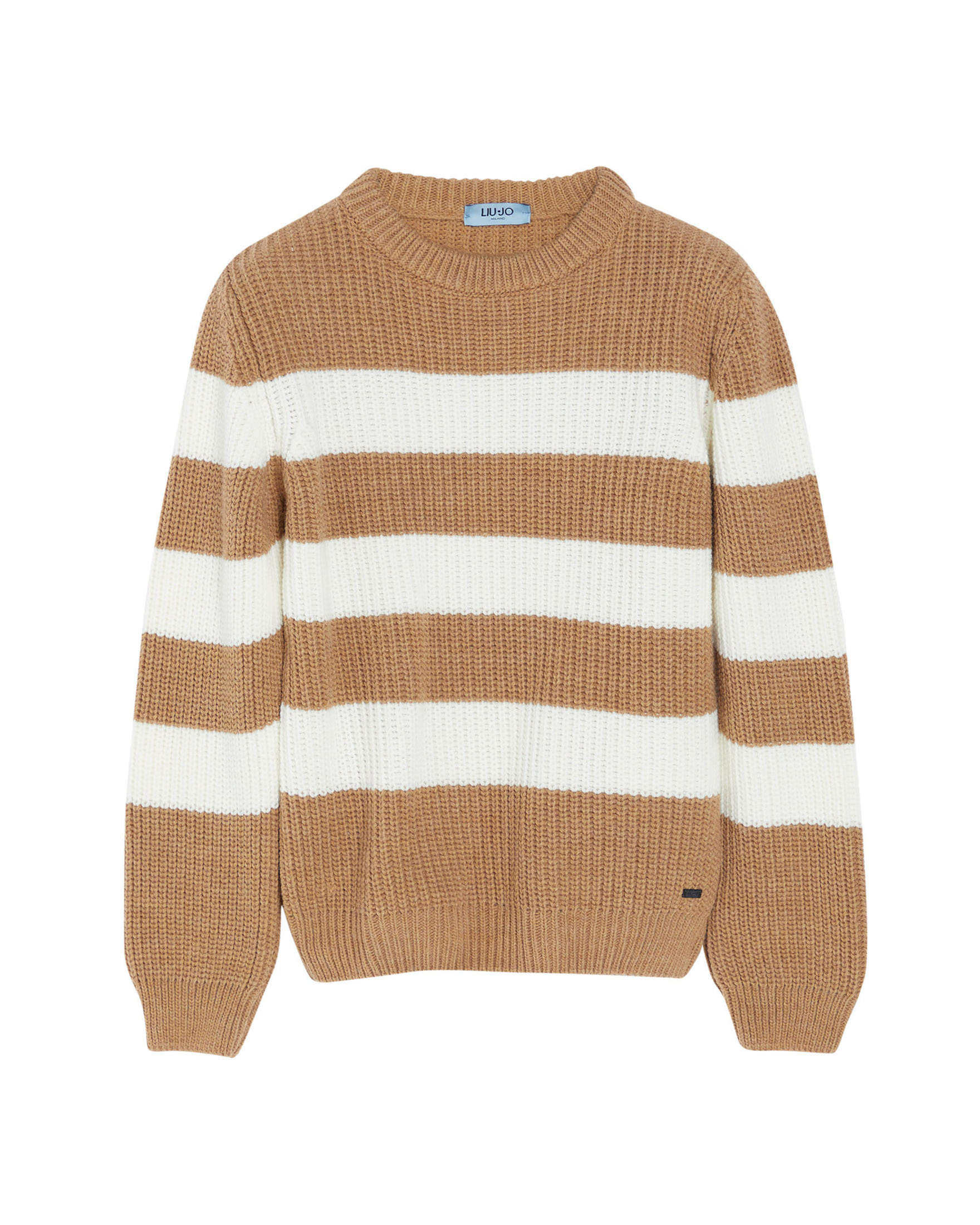 Maglia girocollo in lana punto pannocchia a righe bianche e cammello 10-16 anni