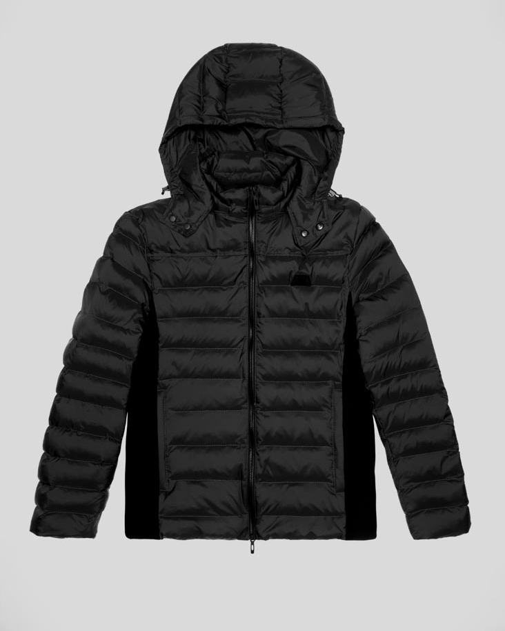 Piumino nero con cappuccio staccabile e inserto in tessuto stretch