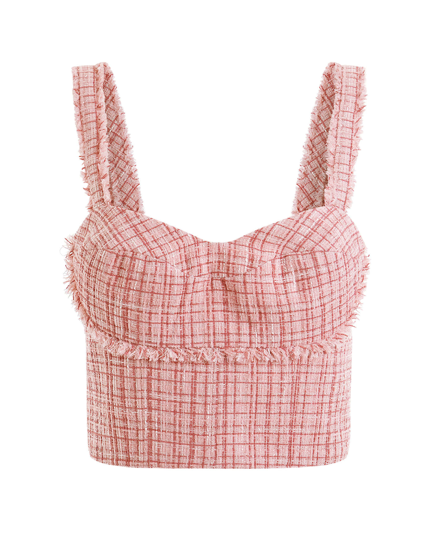 Top bustier rosa smanicato in tweed con dettaglio sfrangiato sotto il seno