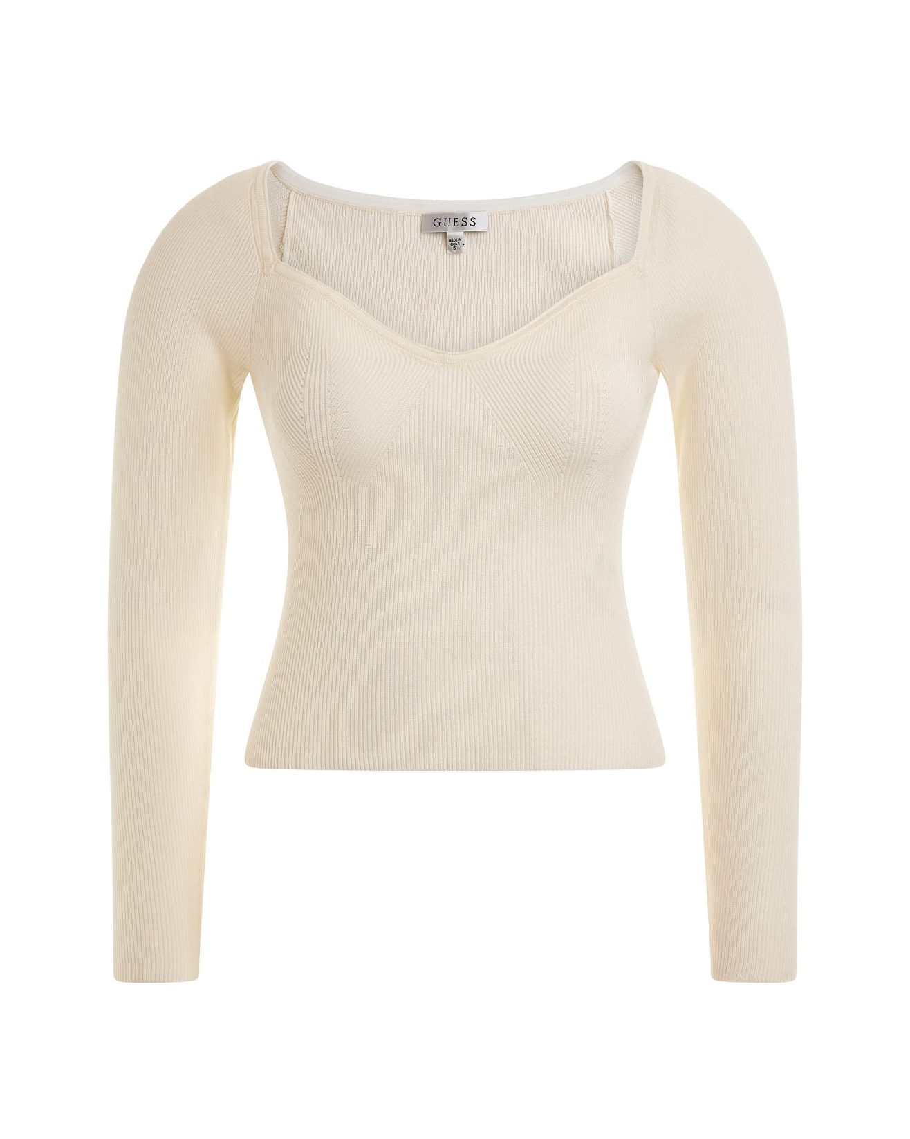 Maglia cropped color ecrù in viscosa a costine con scollo a cuore
