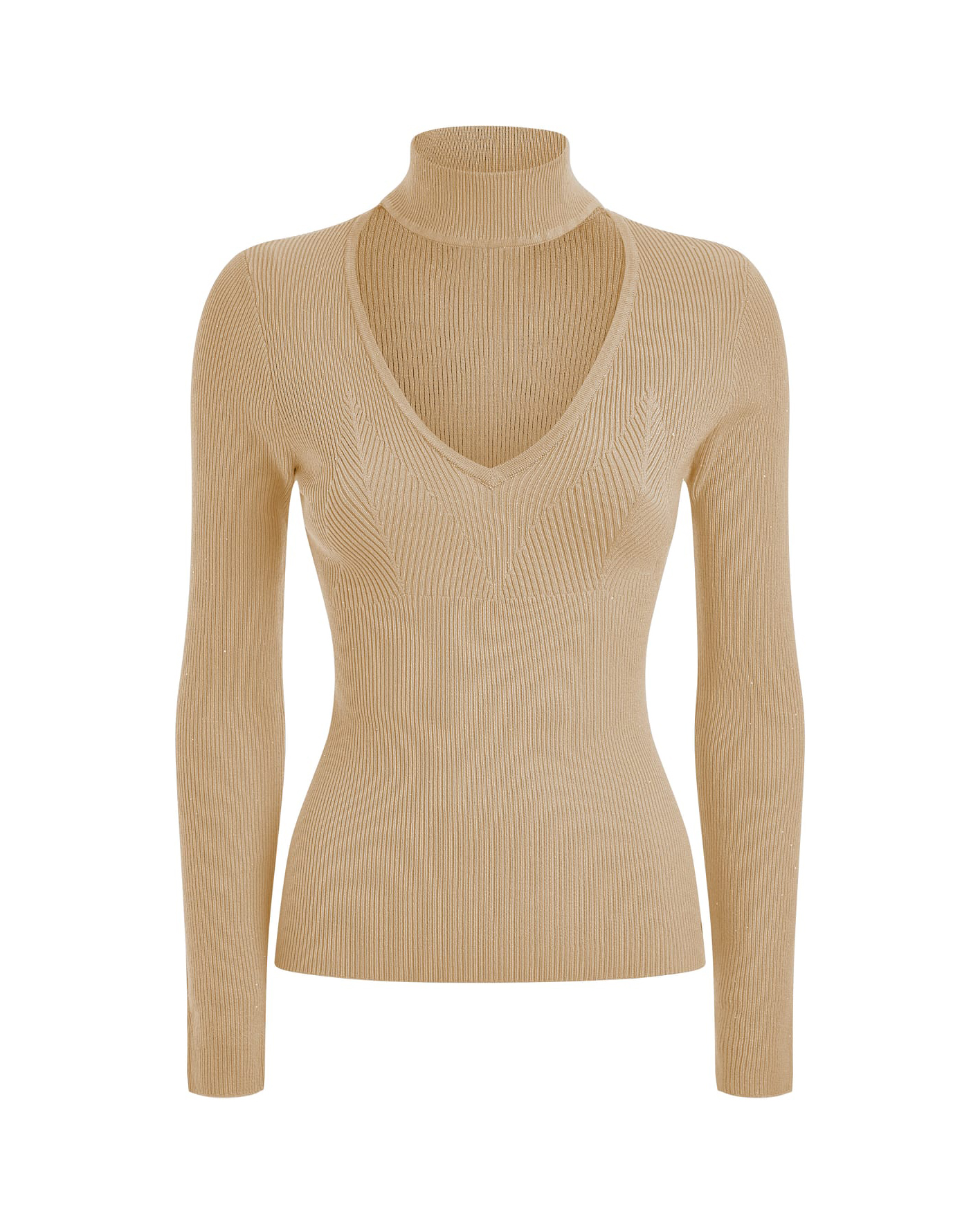 Maglia beige in viscosa a costine con scollo a V profondo e listino sul collo