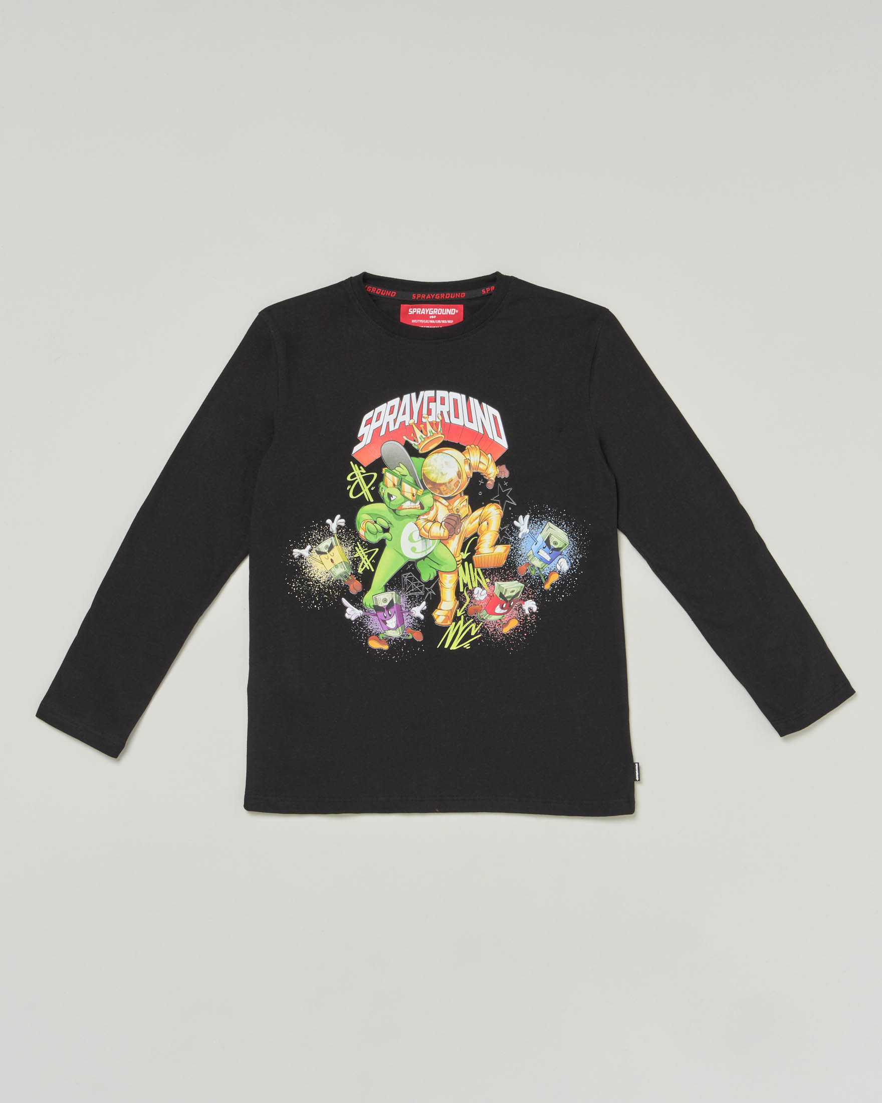 T-shirt nera a manica lunga con stampa grafica astroman e banconote 10-16 anni