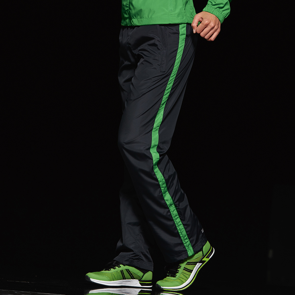 100% poliestere. Pantaloni sportivi in tessuto leggero, antivento, idrorepellente e traspirante. Foderati completamente con tessuto a rete, strisce laterali di colore contrastante, due tasche con chiusura lampo, elastico in vita con cordoncino e chiusura con cerniera alle caviglie, logo catarifrangente.