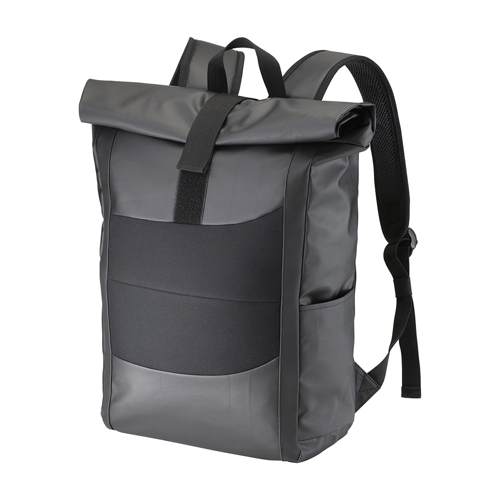 Zaino porta PC in poliestere con rivestimento in PVC senza ftalati e banda frontale in neoprene. Tasca posteriore imbottita per notebook. Ampio scomparto principale ad apertura arrotolabile. Tasche laterali portabottiglie. Schienale e spallacci imbottiti con materiale traspirante Materiale: PU/Polyester Dimensioni: 29X12X60 CM