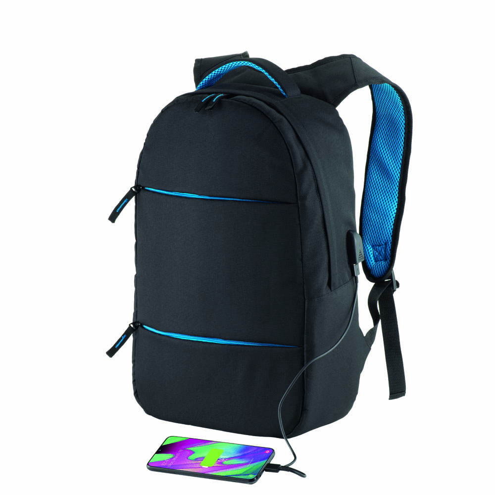 Zaino impermeabile, resistente in poliestere 1680D e pelle PU di alta qualità, spallacci e retro imbottiti. Con vano interno con presa USB per collegamento powerbank -non incluso-, include cavo micro USB di 1 metro di lunghezza per un comfort totale nella ricarica di qualsiasi dispositivo mobile. Con scomparto interno imbottito per notebook fino a 15 ", più tasche interne ed esterne. Materiale: Poliestere 1680D/ PU Lunghezza: 30 cm Larghezza: 14 cm Altezza: 44 cm Peso: 575 gr