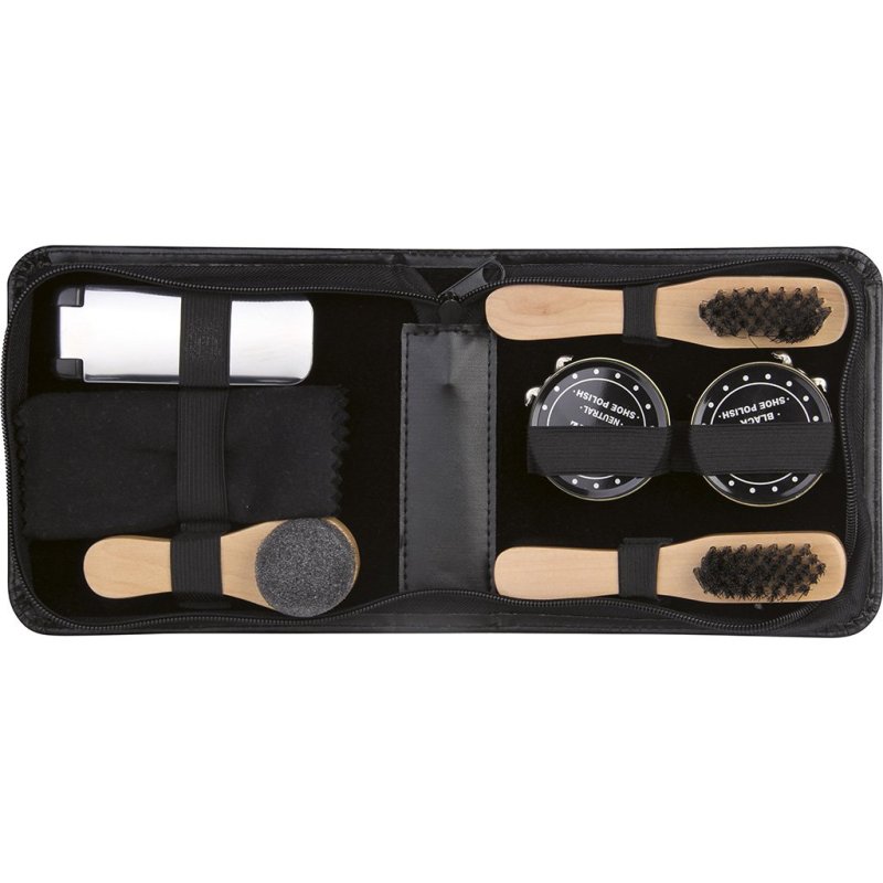 Kit pulizia scarpe, elegante confezione contenente tre spazzole, un panno, un calzante in acciaio con spazzola in tessuto incorporata, un lucido per scarpe neutro e un lucido per scarpe nero, in elegante astuccio in pvc con targhetta in metallo (6x1,5 cm.) personalizzabile.imballi: 30/15 Misure: 14,8x15,2x5 cm. Materiale: pvc/acciaio/legno