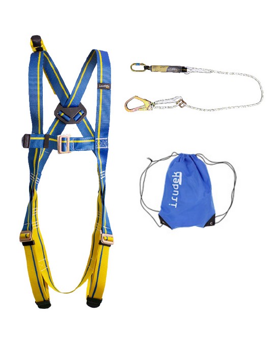 -Imbracatura due punti di ancoraggio,-Arrotolatore anti caduta con cavo in acciaio,-Cordino singolo con moschettone e gancio da ponteggio,-Moschettone,-Borsa a tracolla in Nylon -Imbracatura due punti di ancoraggio,-Arrotolatore anti caduta con cavo in acciaio,-Cordino singolo con moschettone e gancio da ponteggio,-Moschettone,-Borsa a tracolla in Nylon Certificato CE