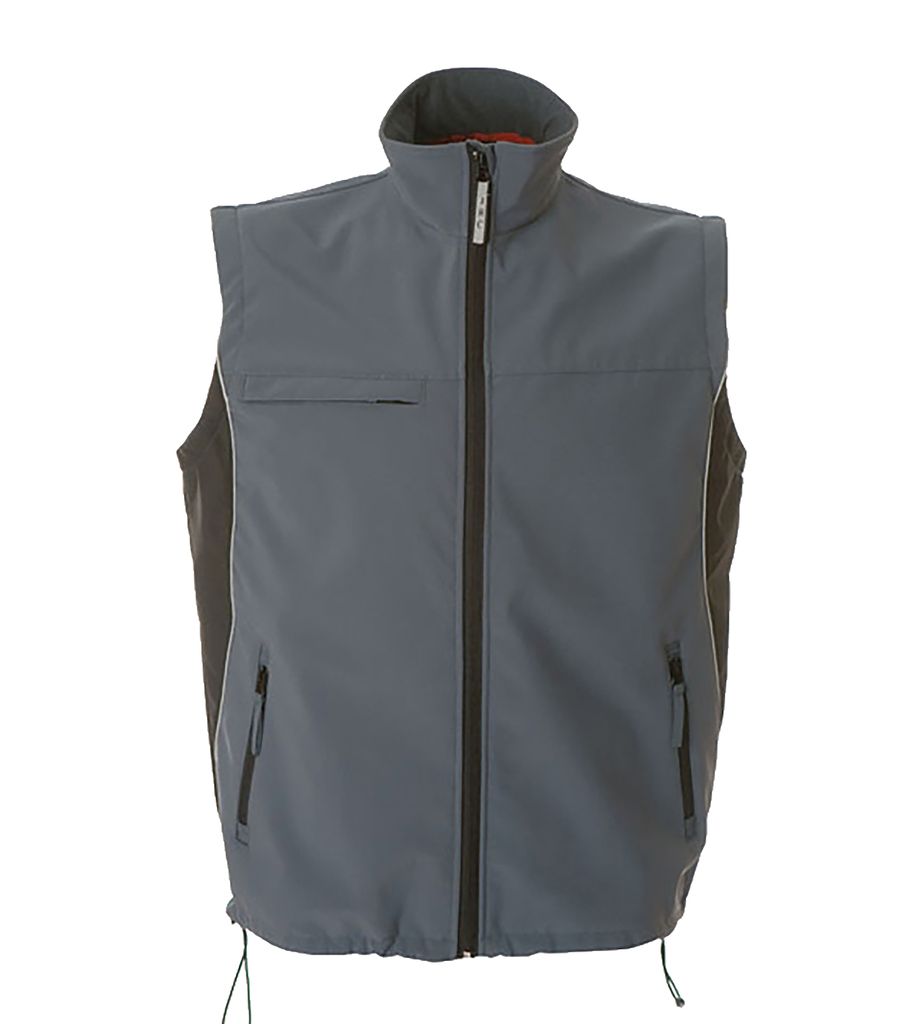 Gilet in soft shell a tre strati impermeabile e traspirante - 97% polyestere - 3% elastan - Impermeabilità 6000 mm/HO - Traspirabilità 4000 g/M2/24h - Interno in pile antipilling - Profili rifrangenti - Cerniere nastrate - Una tasca sul petto con zip e portabadge estraibile a scomparsa - Due tasche esterne con zip - Una tasca interna portafoglio - Un taschino interno portacellulare - Coulisse al fondo