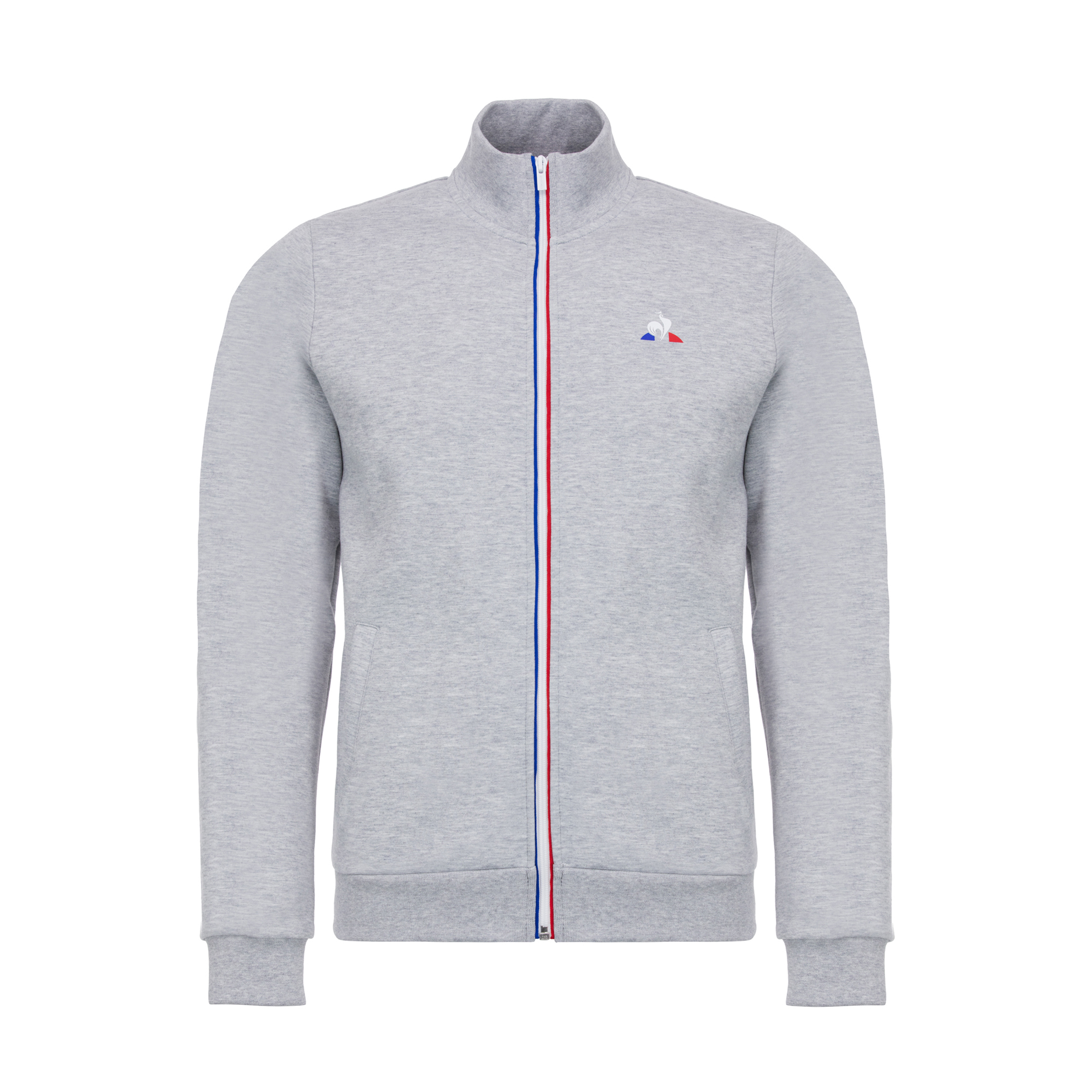 Felpa con cerniera lampo Le Coq Sportif, colore grigio con bordino della cerniera blu e rosso. Il pezzo è fabbricato in Marocco e rifinito in Francia con un tessuto double-face da 300 g in cotone/poliestere (85%-15%). ll taglio è Regular Fit, piacevole da indossare. Logo "Le Coq" trasferibile.