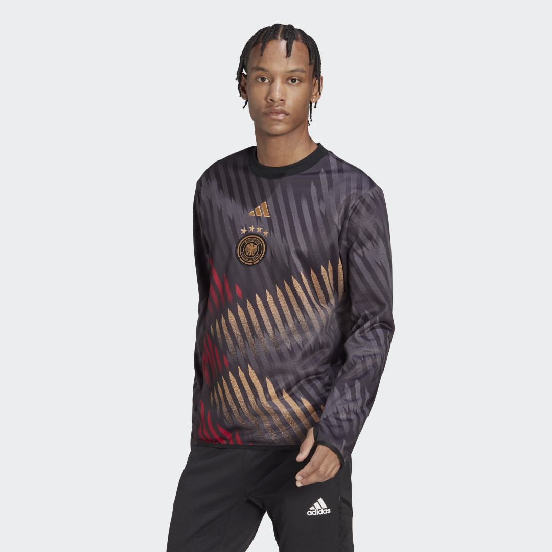 Sempre pronto a partire. Questa maglia da calcio adidas è ispirata al modello indossato dai giocatori della Nazionale tedesca durante il riscaldamento prepartita. I polsini sono dotati di asole per i pollici per una maggiore protezione, mentre la tecnologia AEROREADY mantiene la pelle asciutta e dona il massimo comfort. Lo stemma centrale, preso in prestito dalla maglia away della squadra, mette subito in chiaro la tua fede calcistica.Realizzato integralmente con materiali riciclati, questo prodotto è solo una delle nostre azioni concrete per contrastare l'inquinamento causato dai rifiuti plastici.