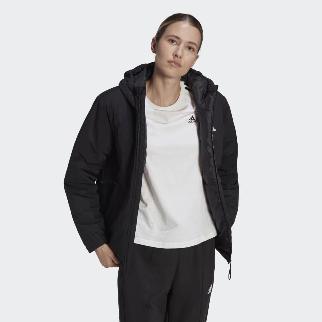 Ovunque ti porti la giornata, assicurati di rimanere sempre al caldo. Questa giacca adidas con isolamento termico presenta un collo alto e un cappuccio elasticizzato per proteggerti dal freddo quando scendono le temperature. Il cordino sul'orlo offre uno schermo efficace nelle fredde mattine o durante le gite del weekend con la famiglia.